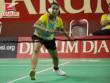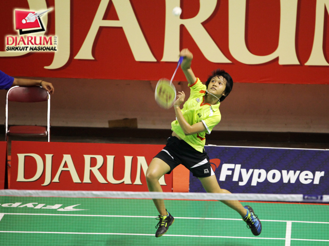 Mega Cahya (Pusdiklat Jaya Raya) berusaha mengembalikan bola ke arah Febby Angguni (PB Djarum Kudus).