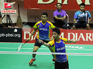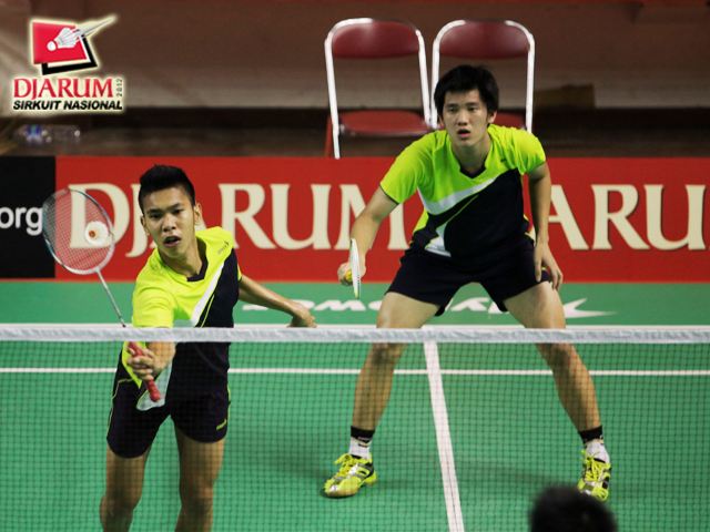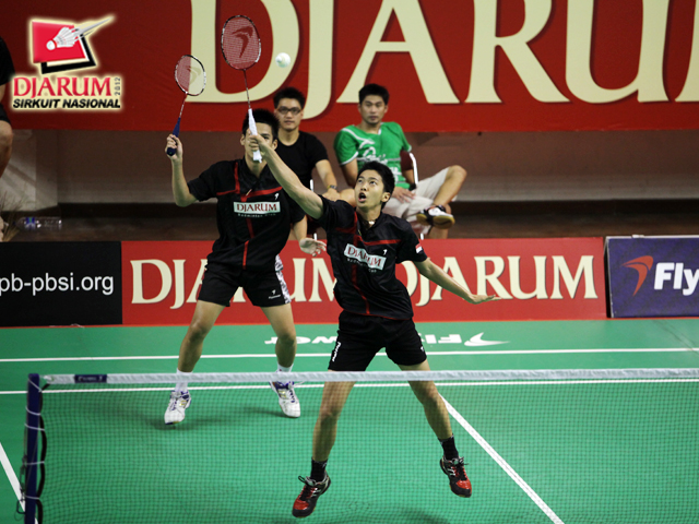 Aji/Sandro Nikolas (Tangkas Specs) menyambut serve dari pasangan Abu Bakar/Ricky Alverino (PB Djarum Kudus).