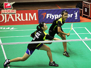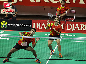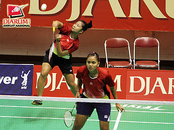 Jovita Evania/Novalita Anggreani (Mutiara Bandung) berusaha menggapai shuttlecock.