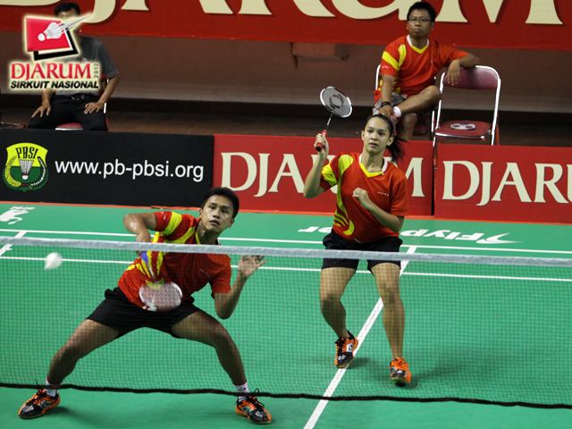 Unggulan pertama ganda campuran taruna, Rian Swastedian/Masita Mahmudin (Pusdiklat Jaya Raya) mengembalikan bola ke arah pasangan Hidayat Setiawan/Widya Tiffany (Tangkas Specs).