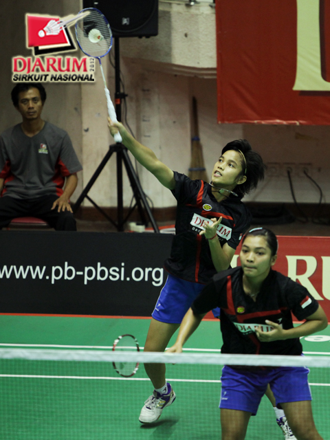Pasangan ganda putri taruna PB Djarum Kudus, Febriani Endar/Ristya Ayu bersiap mengembalikan bola ke arah pasangan Jovita Evania/Novalita Anggreani (Mutiara Bandung).