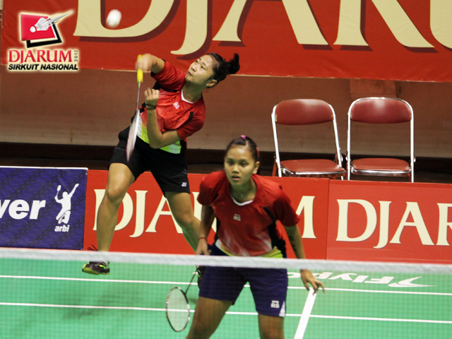 Unggulan pertama ganda putri taruna, Ila Alvionitasari/Ni Ketut Mahadewi (Jaya Raya Suryanaga) melepaskan smash keras ke arah pasangan Masita Mahmudin/Shelawati (Pusdiklat Jaya Raya/Exist Jakarta).