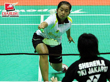 Fina Nuraena (SGS PLN) sedang memukul kok untuk dikembalikan kepada Sheren Regina Natsir (Pelatprov DKI).