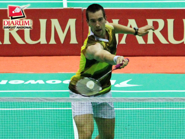 Mirco Parschau, pemain asal Jerman, dalam posisi siap mengembalikan kok kepada lawannya, Yohanes Hendry Aprilianto dari SGS PLN.