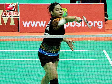 Pia Zebaidah Bernadet dari Pusdiklat Jayaraya sedang memukul kok untuk dikembalikan kepada lawannya, Ana Rovita dari Djarum Kudus.