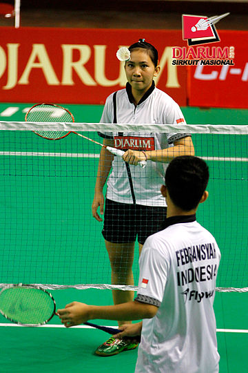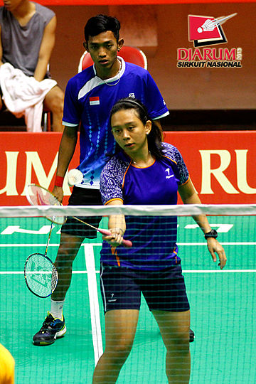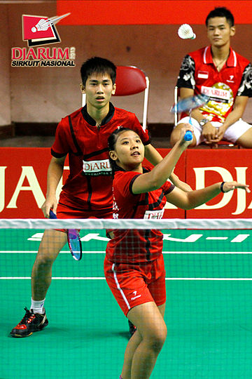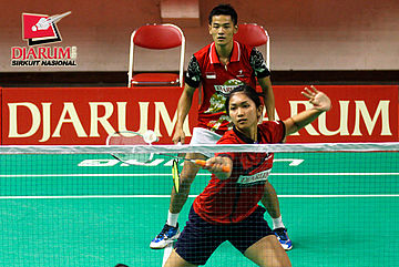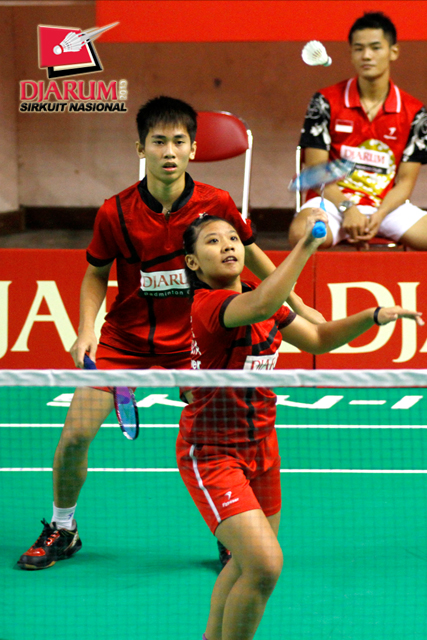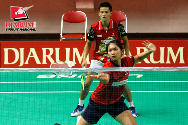 Darmiko/Deariska Putri (PB Djarum) mengembalikan shuttlecock ke arah Ahmad Rivai/Dian Fitriani (Bank Sumsel Babel/Jaya Raya).