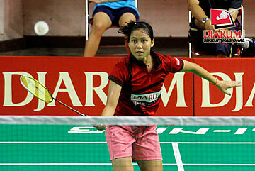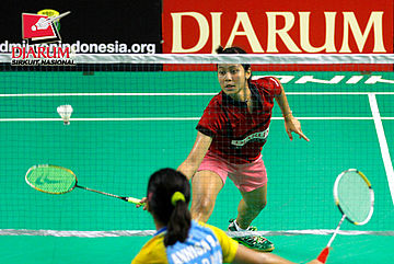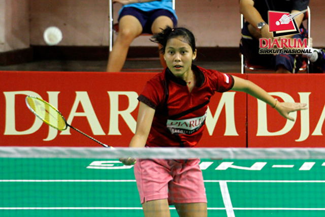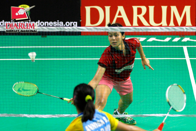 Agdevika Rochmadani (PB Djarum) berusaha menyambut pengembalian shuttlecock dari Anisa Syafarani (Jaya Raya AZ Zikra).