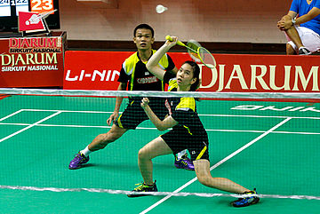 Andre Pinstikaa/Tutut Novi (PB Djarum) menyambar pengembalian tanggung yang diberikan pasangan Lilik Sugianto/Linda Eva (Jaya Raya Metland/Citra Raya Unesa).