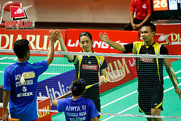 Agus Salim/Anggelica Caroline (Mutiara Bandung) dan Daru Mega/Anita Wahyuningtyas (Kejora/Pelatprov Bali) saling bersalaman usai bertanding.