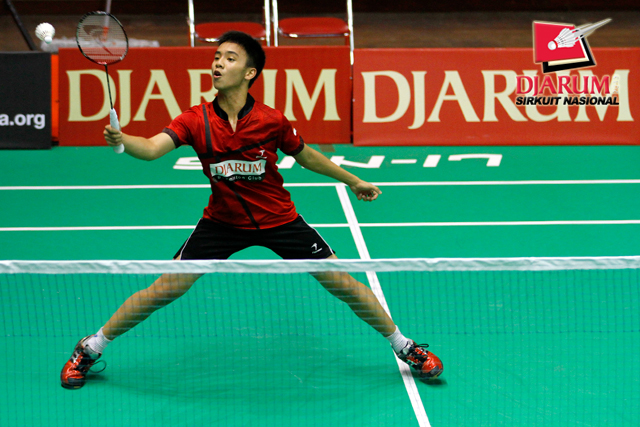 Calvin Ryan Mamonto (PB Djarum) mengembalikan shuttlecock ke arah M. Ahdial (Pelatprov DKI Jakarta).