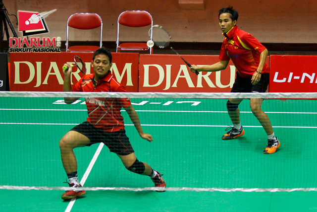 Andre Pinstikaa/Tutut Novi (PB Djarum) berhasil menghadang dan mengembalikan shuttlecock ke arah pasangan Lilik Sugianto/Linda Eva (Jaya Raya Metland/Citra Raya Unesa).