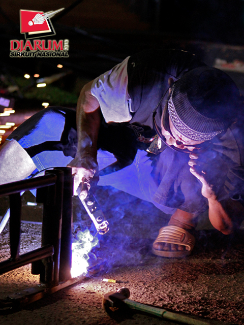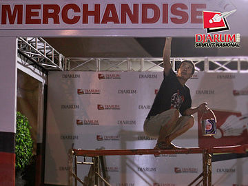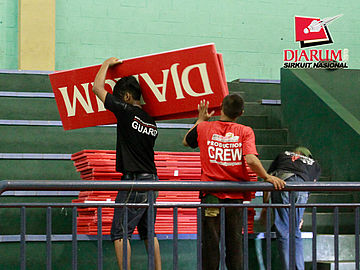 Seorang pekerja sedang mempersiapkan booth Merchandise Djarum Sirkuit Nasional Jakarta Open 2013.