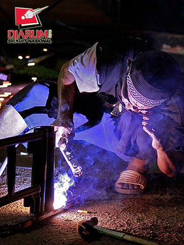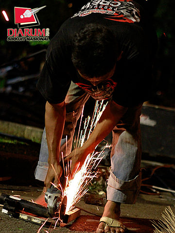 Seorang pekerja sedang mempersiapkan banner Djarum.