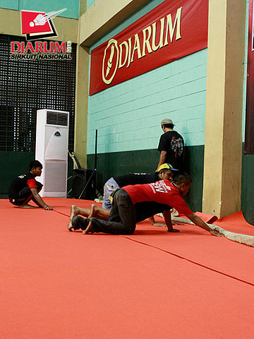 Para pekerja sedang mempersiapkan karpet lapangan di Hall Bulutangkis Asia Afrika.