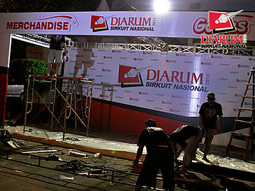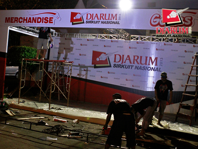 Beberapa pekerja sedang mempersiapkan booth Merchandise Djarum Sirkuit Nasional Jakarta Open 2013.