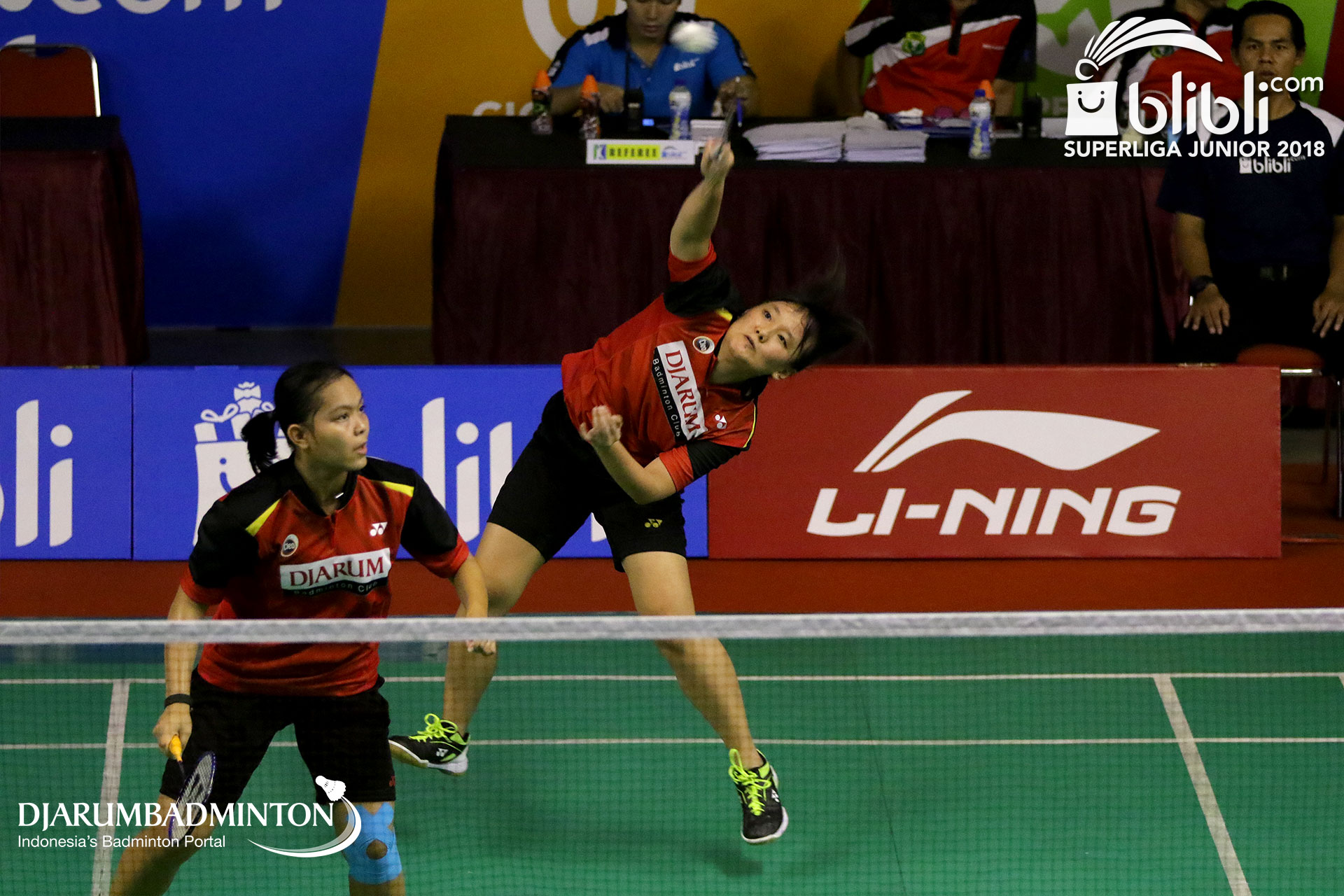 Agatha Imanuela/Siti Fadia Silva Ramadhanti (PB. DJARUM) bersiap menyambar pengembalian