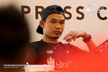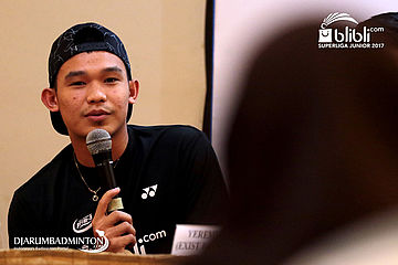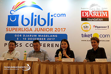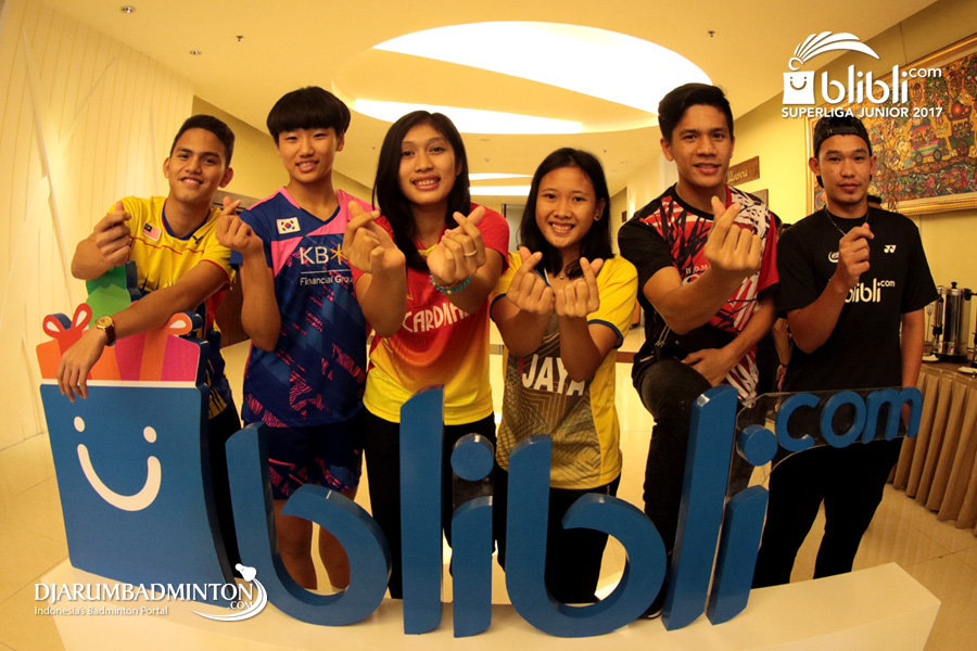 Dari Kiri Ke Kanan: Muhammad Syahmi (Malaysia), An Seo Young (Korea), Choirunnisa (PB Mutiara Cardinal), P.H Mentari (PB Jaya Raya), Yeremia Erich (PB Bxist) Dan Rinov Rivaldy (PB Djarum) Berpose Ala Korea Usai Press Conference Blibli.com Superliga Junior