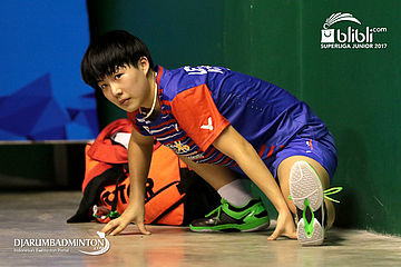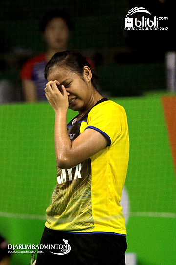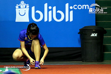 Tan Min Er (Malaysia) Mengikat Tali Sepatu Sebelum Memulai Pemanasan