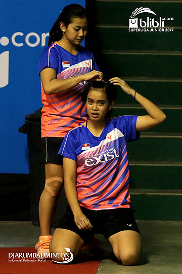Salsabila Vahira (Kiri) Membantu Merapikan Rambut Diana Setiyo Ningsih (Exist Badminton Club)