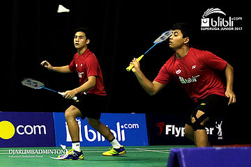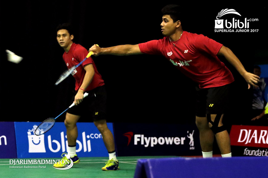 Bernadus Bagas Kusuma Wardana/Dwiki Rafian Restu (Djarum) Menghadang Serangan