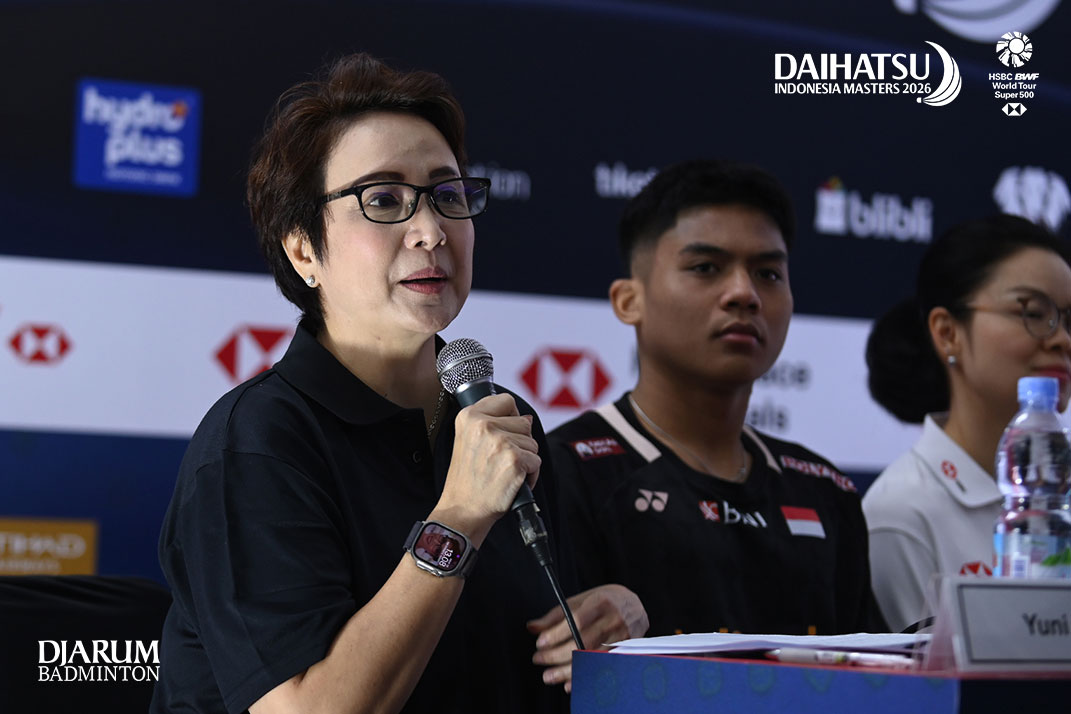 Kepala Bidang Humas PP PBSI Yuni Kartika membuka sesi jumpa pers Indonesia Masters 2026