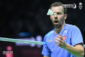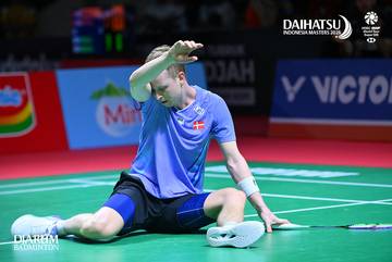 Pemain ganda putra Denmark, Anders Skaarup Rasmussen, dalam laga babak pertama Indonesia Masters 2026