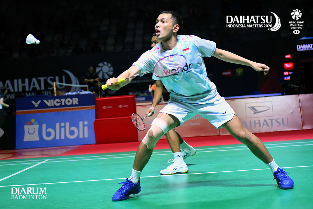 Aksi ganda putra Indonesia, Fajar Alfian/Muhammad Shohibul Fikri, di babak pertama Indonesia Masters 2026