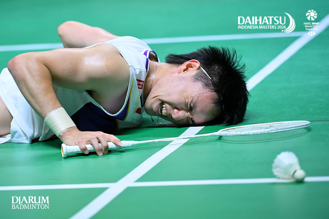 Pemain ganda putra Indonesia, Nikolaus Joaquin, terjatuh usai berupaya menjangkau bola