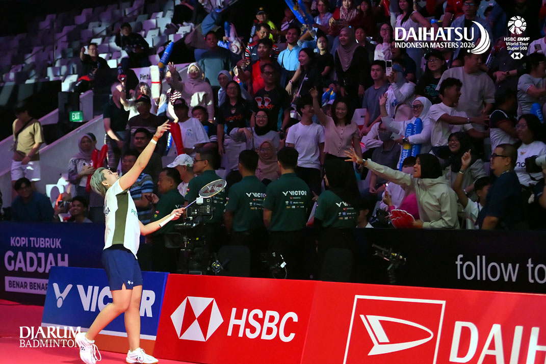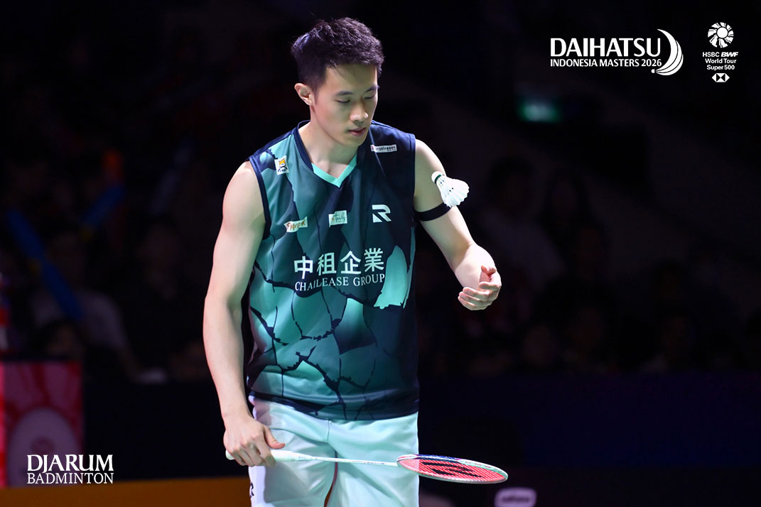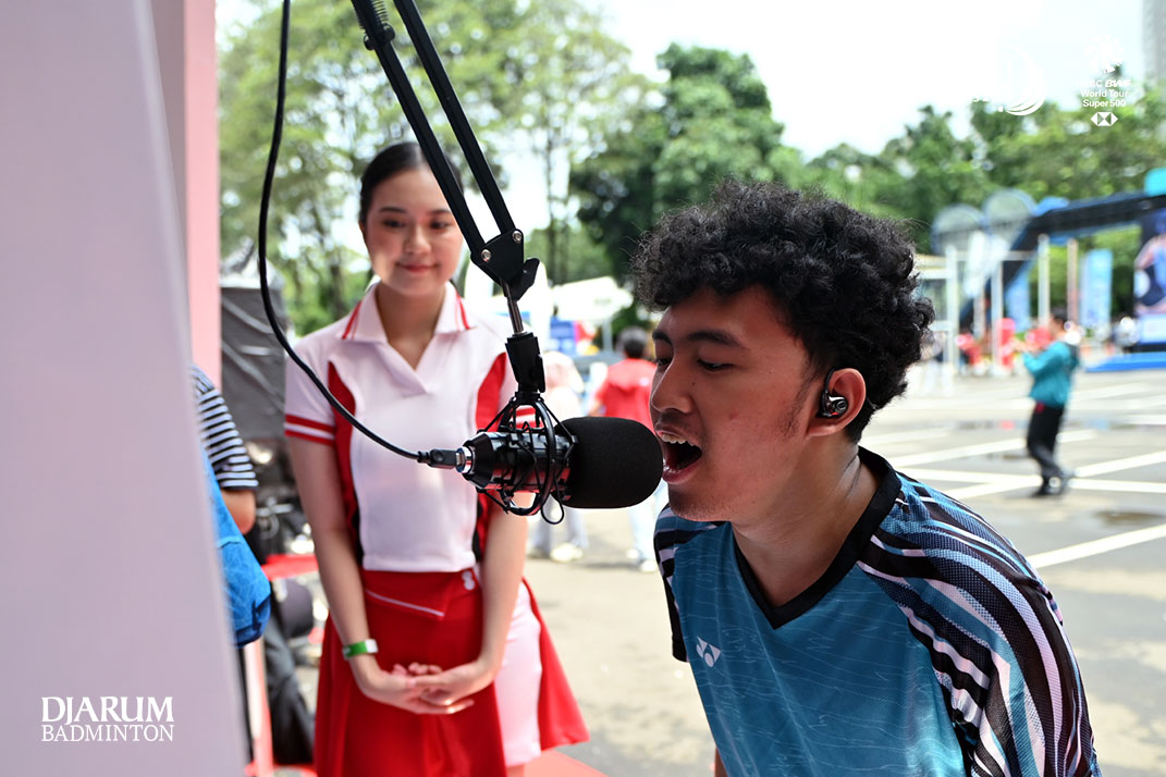 Toh Ee Wei (Malaysia) melempar kaos ke penonton di Istora GBK