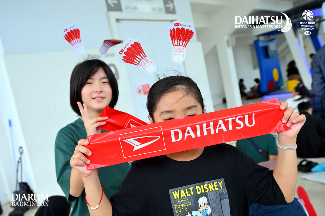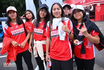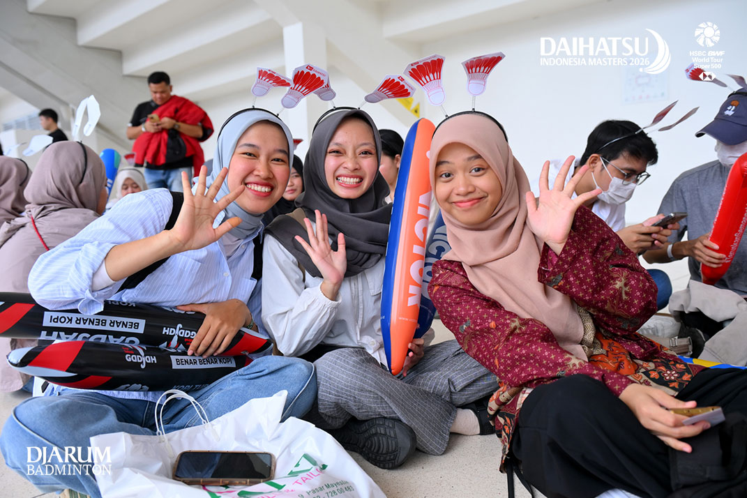 Penonton berpose foto saat mengantri masuk ke dalam Istora GBK