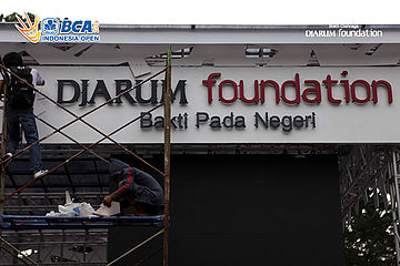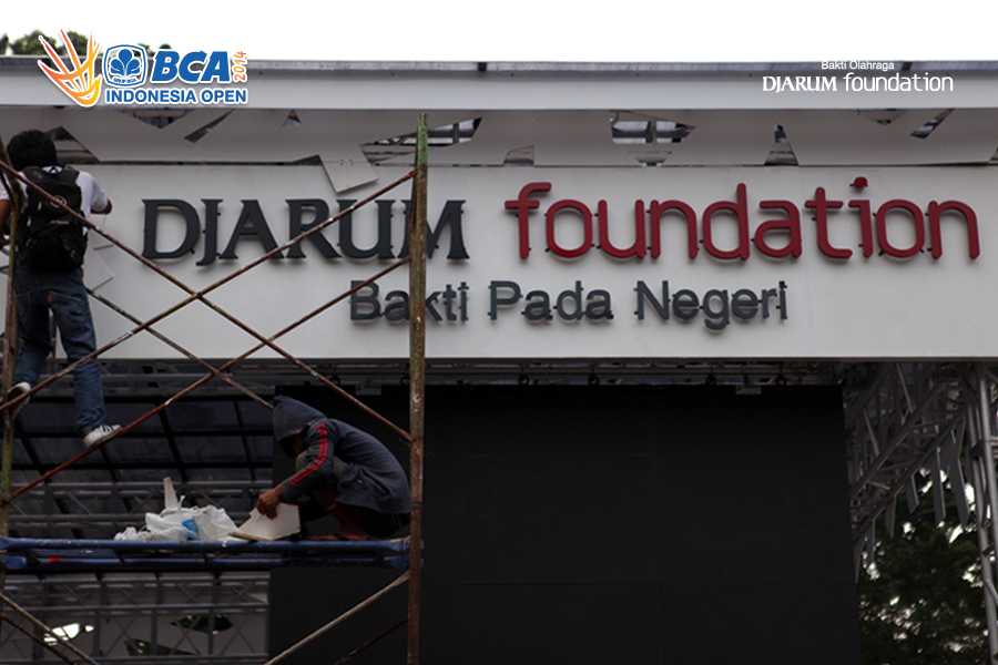 Dua orang pekerja saat menyelesaikan dekorasi di booth Djarum Foundation