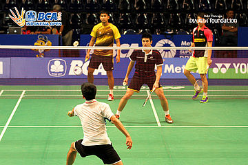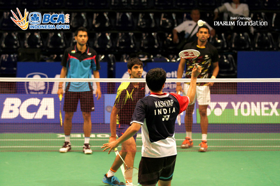 Kashyap Parupalli (India) saat berlatih bertahan melawan tiga temannya