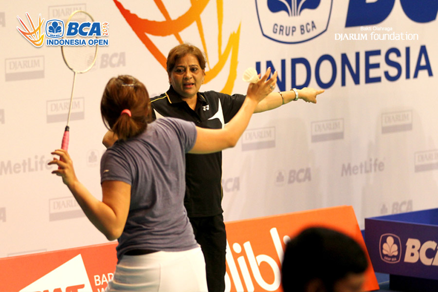 Jwala Gutta (India) mendapatkan arahan pelatih saat berlatih di Istora Senayan