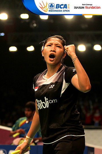 Ekspresi Lindaweni Fanetri (Indonesia) saat berhasil mencuri poin dari Nichaon Jindapon (Thailand)