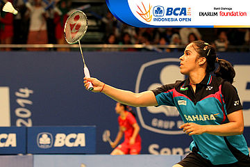 Saina Nehwal (India) menyambar pengembalian dari Porntip Buranaprasertsuk (Thailand)