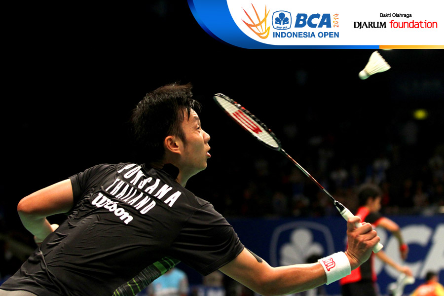 Bonsak Ponsana (Thailand) berhasil menghadang serangan yang dilepaskan Hans-Kristian Vittinghus (Denmark)