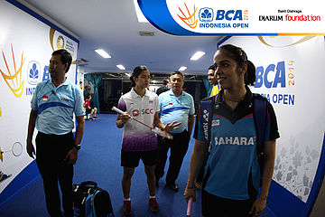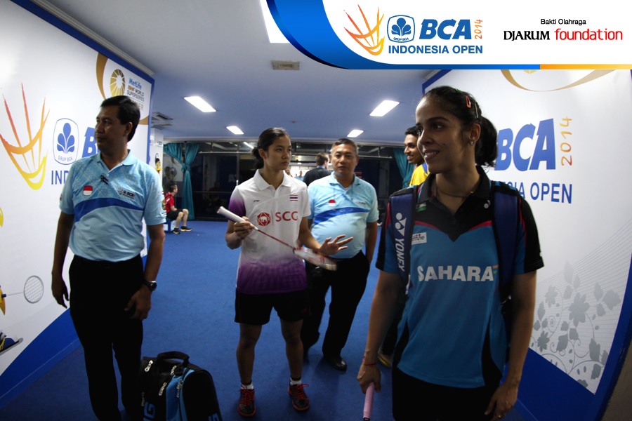 Saina Nehwal (India) dan Porntip Buranaprasertsuk (Thailand) bersiap untuk memasuki arena pertandingan