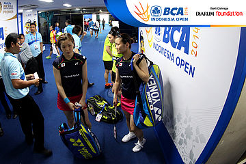 Miyuki Maeda/Reika Kakiiwa (Jepang) bersiap memasuki arena pertandingan