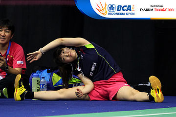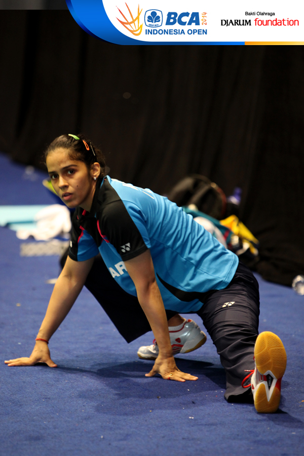 Saina Nehwal (India) melakukan pemanasan di warming up hall