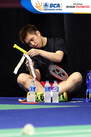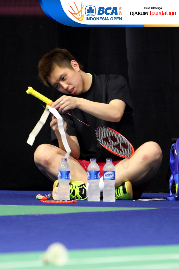 Kenichi Tago (Jepang) sedang memperbaiki raket disela-sela pemanasan