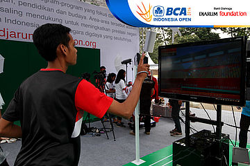 Salah satu pengunjung sedang bermain game di booth Djarum Foundation