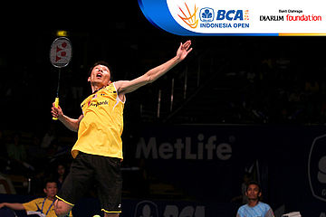 Lee Chong Wei (Malaysia) bersiap melepaskan jumping smash