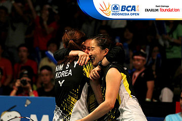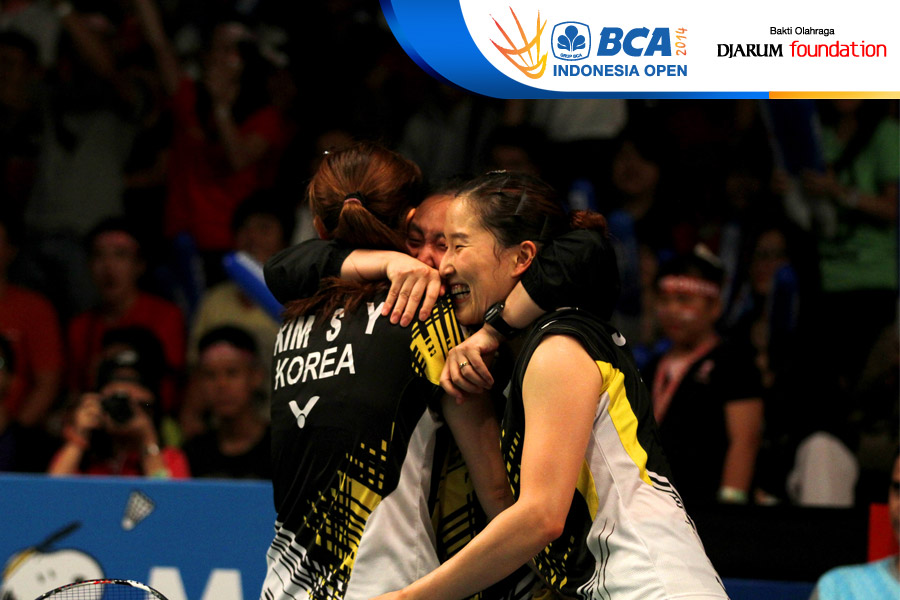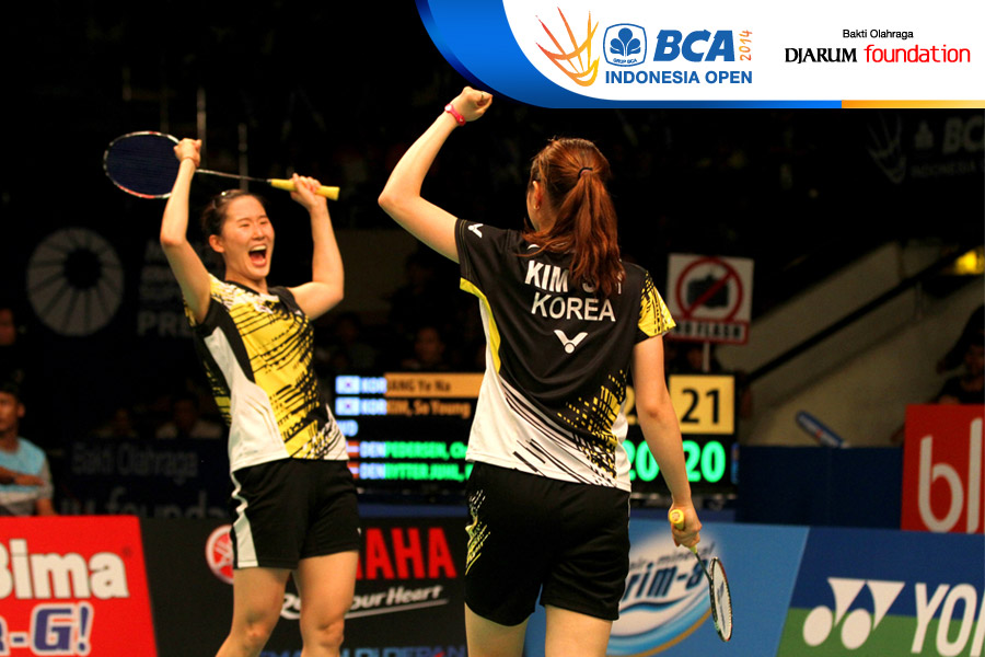 Selebrasi Jang Ye Na/So Young Kim (Korea Selatan) setelah berhasil mengalahkan Christinna Pedersen/Kamilla Rytter Juhl (Denmark)