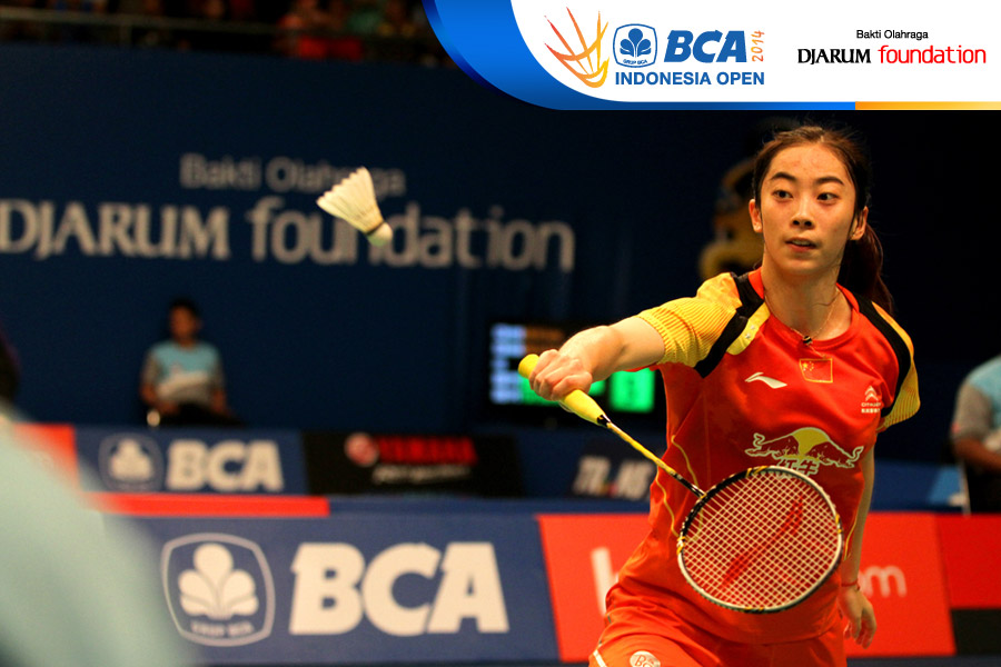 Wang Shixian (China) bersiap mengembalikan shuttlecock ke arah Busanan Ongbumrungpan (Thailand)