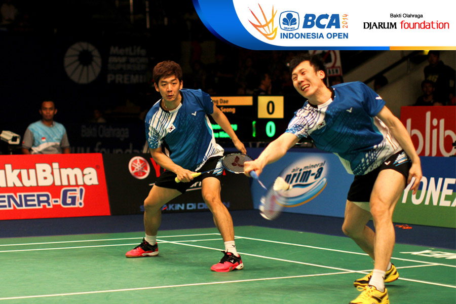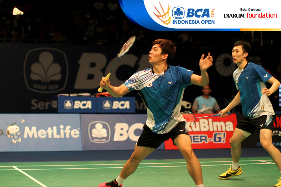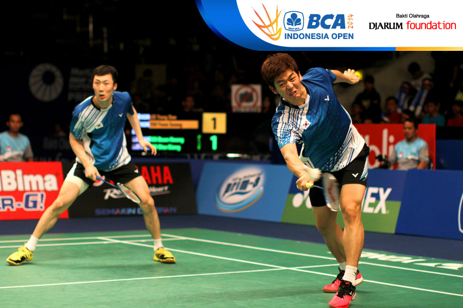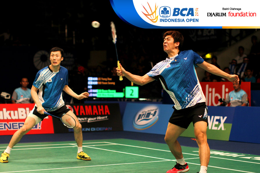 Lee Yong Dae/Yoo Yeon Seong (Korea Selatan) berhasil menghadang serangan yang dilepaskan Tan Boon Heong/Tan Wee Kiong (Malaysia)