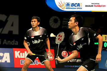 Hendra Setiawan/Mohammad Ahsan (Indonesia) menghadang serangan yang dilepaskan Markis Kido/Markus Fernaldi Gideon (Indonesia)