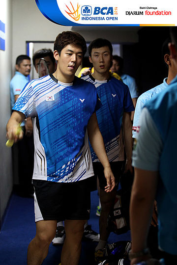 Lee Yong Dae/Yoo Yeon seong (Korea) bersiap memasuki lapangan pertandingan