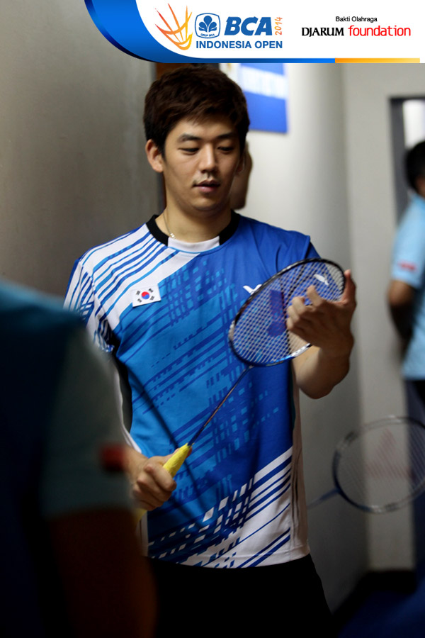 Lee Yong Dae (Korea) sedang memeriksa raket untuk bertanding