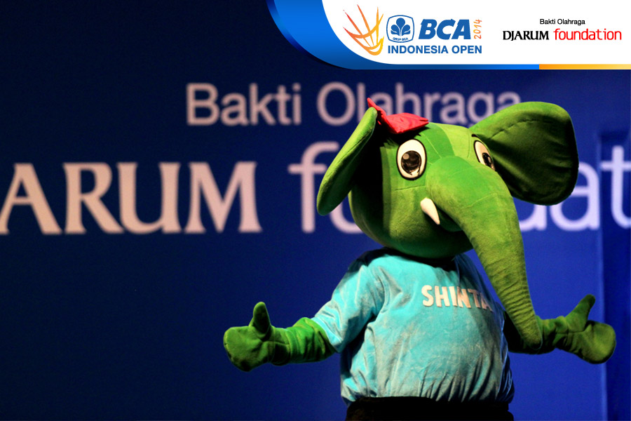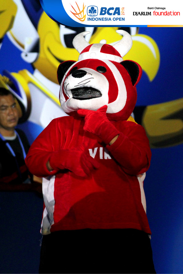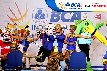 Sejumlah penari dan beberapa Maskot BCA Indonesia Open Super Series Premiere 2014, menari bersama