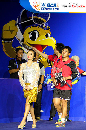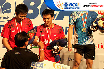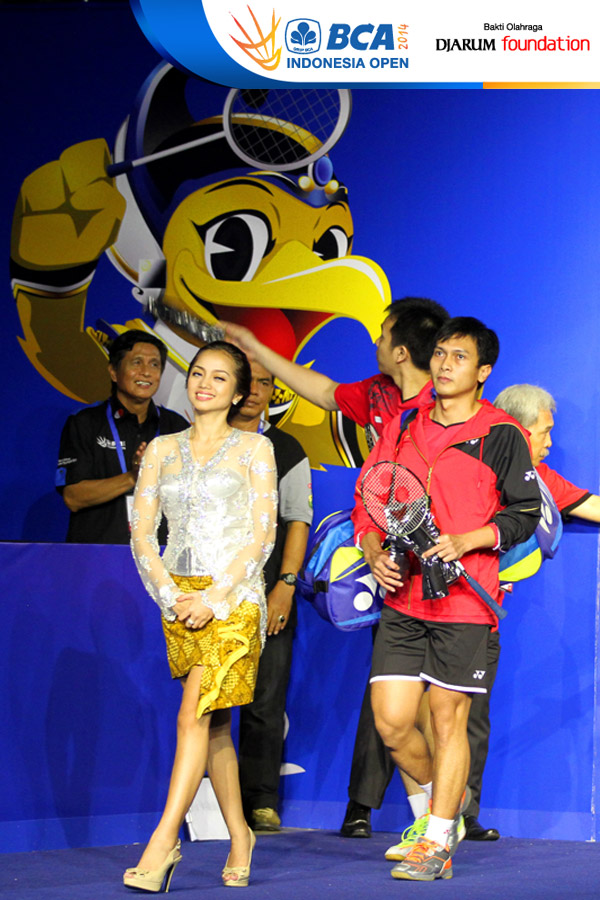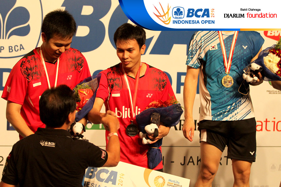 Hendra Setiawan/Mohammad Ahsan (Indonesia) saat di podium runner up BCA Indonesia Open Super Series Premiere 2014
